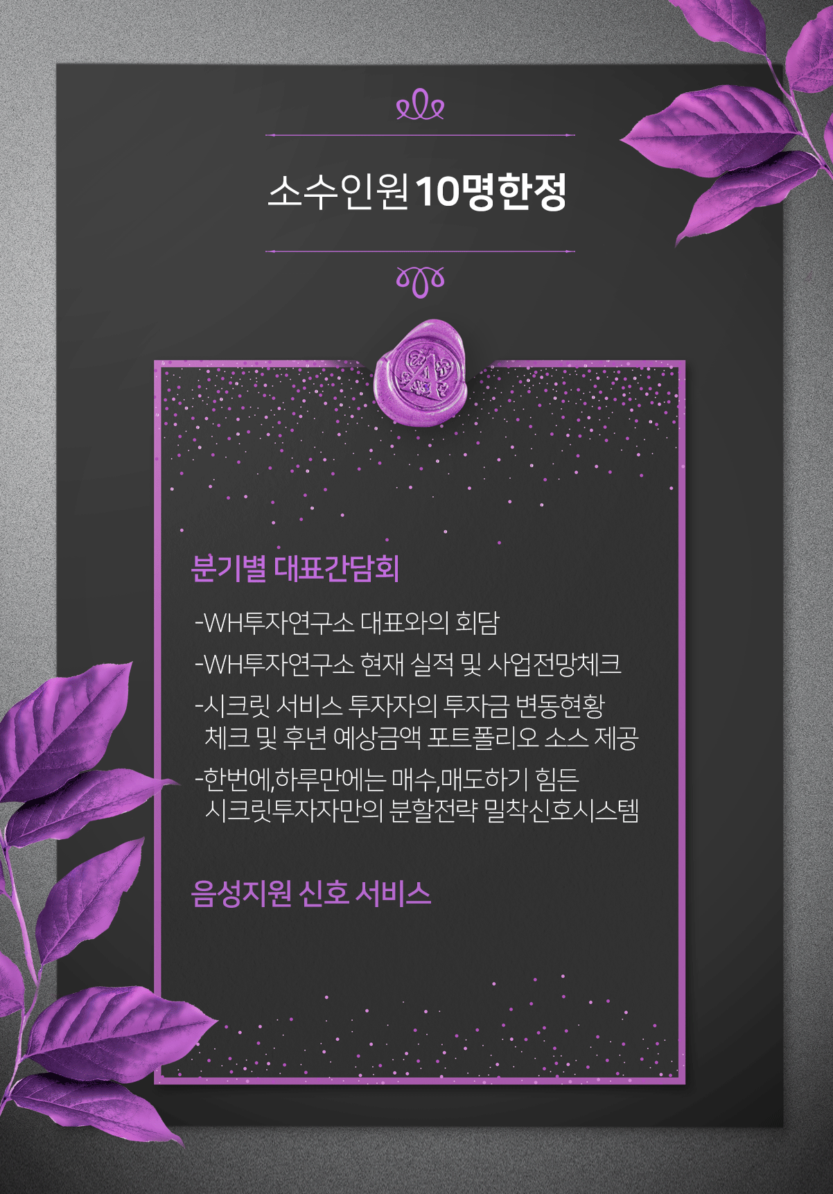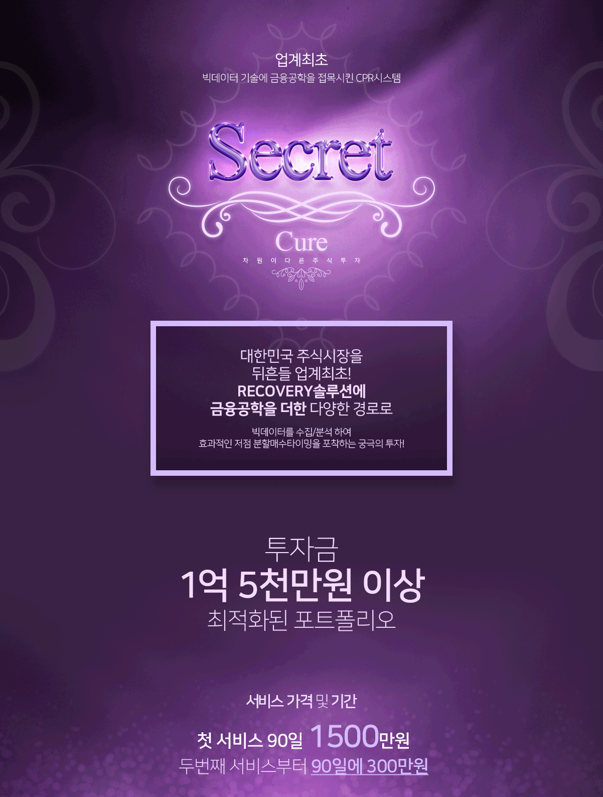 SECRET큐어 서비스안내 - SECRET큐어 서비스의 첫 서비스 기간은 90일이며 이후 추가 연장시 서비스 기간은 90일입니다. - 서비스 기간 종료 후 추가 연장을 하지 않으면 자동으로 서비스가 종료됩니다. - 본 서비스는 서비스 신청한 본인만 사용할 수 있으며, 다른 사용자에게 서비스 양도는 불가합니다. - 서비스 시간은 한국 증시 개장날의 개장시간(오전 9시)부터 폐장시간(오후 3시 30분)까지입니다. (증시 개장시간 변경에 따라 변경될 수 있습니다.) - WH투자연구소에서 제공한 종목 한에서 리딩이 제공됩니다. 첫 서비스 환불약관 - 유료 서비스 이용기간에는 주말 및 공휴일도 포함됩니다. - 서비스 시작일 전에는 전액 환불이 가능합니다. - 환불 받을 수 있는 금액은 결제한 금액에서 환불수수료와 컨텐츠 이용금액 제외한 금액에서 서비스 이용한 금액을 뺀 금액입니다. - 제공받은 컨텐츠의 환불은 환불약관에 따라 차감되어 계산됩니다. · 1일 서비스 이용금액: 결제금액 ÷ 90일 · 환불수수료: 결제금액의 10% · 환불 받을 수 있는 금액 결제금액 - 환불수수료(결제금액의 10%) - 컨텐츠 이용금액 - {(결제금액 × (서비스 이용일 수 ÷ 서비스 기간)} 컨텐츠 환불약관 - SECRET큐어 서비스에 포함된 컨텐츠 자료는 이용약관에 따라 청약철회가 불가한 '디지털컨텐츠' 상품이므로 제공료는 환불시에 전액 차감됩니다. · ESSENCE교육자료 20종 + SECRET교육자료 20종 + 기업VIEW 자유이용권: 500,000원 · CPR어시던트 프로그램: 200,000원 연장 서비스 환불약관 - 유료 서비스 이용기간에는 주말 및 공휴일도 포함됩니다. - 서비스 시작일 전에는 전액 환불이 가능합니다. 환불 받을 수 있는 금액은 결제한 금액에서 환불수수료를 제외한 금액에서 서비스 이용한 금액을 뺀 금액입니다. · 1일 서비스 이용금액: 결제금액 ÷ 90일 · 환불수수료: 결제금액의 10% · 환불 받을 수 있는 금액 결제금액 - 환불수수료(결제금액의 10%) - {(결제금액 × (서비스 이용일 수 ÷ 서비스 기간)} 환불시 주의사항 - 환불시에는 환불신청서를 작성하셔야 합니다. - 환불신청서를 작성시 환불금액을 받을 은행명, 은행계좌번호, 예금주명을 정확히 알려주셔야합니다. (예금주가 다를 경우 본인인증 필요) - 잘못된 정보 입력으로 인한 환불과정에 문제가 있을 경우에는 회원 본인에게 책임이 귀속됩니다.