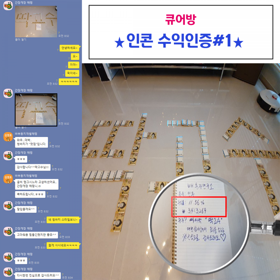 인콘 수익현금인증! 페이지 정보 작성자 WH투자연구소 작성일19-10-17 17:28 조회10,766회 댓글0건 관련링크 목록 본문 인콘 수익 계좌 인증했었죠~?이제 현금 뽑아서 현금 인증해주셨습니다!그중에는 이제 원금복구하신분까지 탄생!!! ㅊㅋㅊㅋ~딱고수 이름도 잘 보이고 적어주시고~ 지금까지 무패로 이어가고 있고 이 무패가 계속 이어갈 수 있도록더 열심히 가보겠습니다!!!파이팅!!! 댓글목록 등록된 댓글이 없습니다. 목록