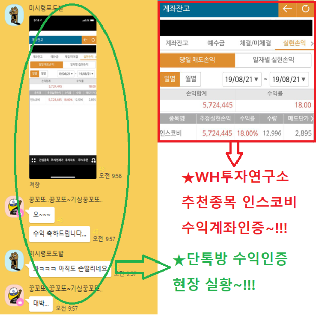 저희 WH투자연구소에서 제대로 바닥구간 매집포인트를 잡아서 매수신호를 드린 그 종목 바로 인스코비~!!! 직접 영상도 찍으면서 올렸던 종목인데요~